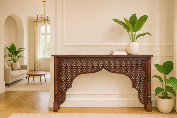 The Aranya Jaali Console Table is a striking showcase of artisanal craftsmanship and architectural grace. Handcrafted from solid wood and finished in a rich mahogany polish, it features an elaborate hand-carved jaali front - a geometric lattice inspired by traditional Indian archways.