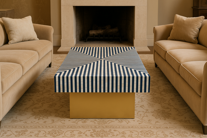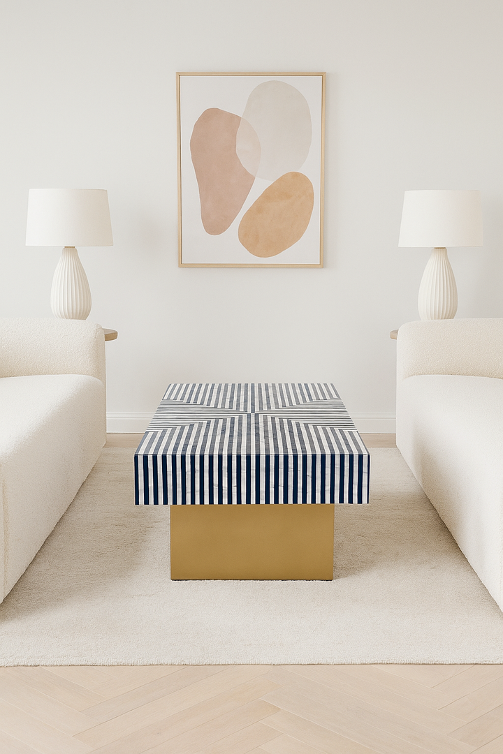 Bold, modern, and exquisitely handcrafted, the Aurora Coffee Table is a radiant centrepiece designed to captivate. The top features a meticulous inlay of genuine mother of pearl and deep navy resin, arranged in a striking geometric burst that commands attention. Resting atop a sleek brass-finished base, the design plays with contrast - organic shimmer above, grounded glamour below.