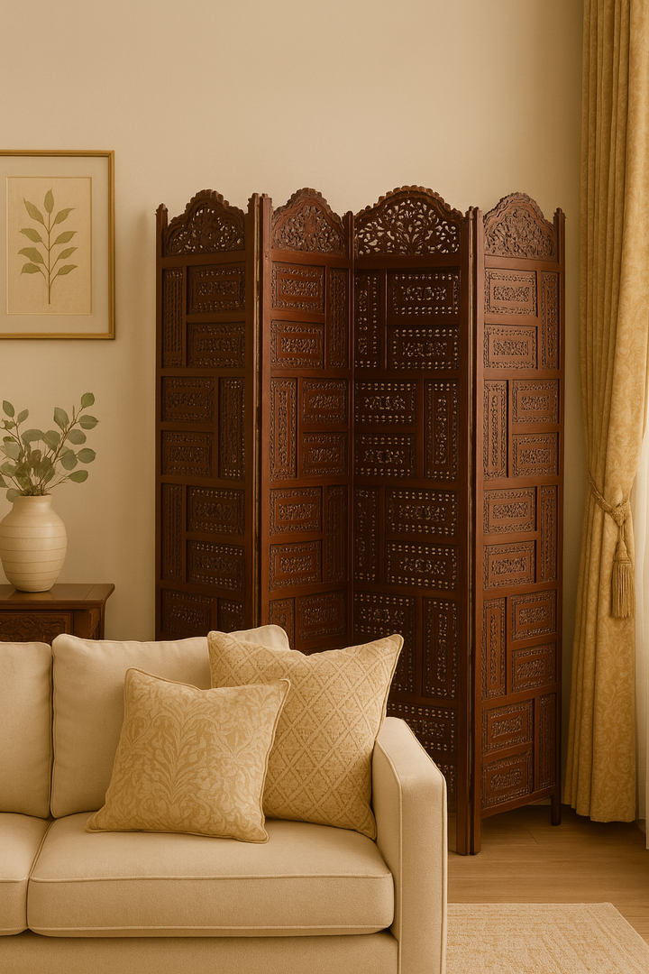 Elevate your space with the timeless charm of the Deewar-e-Nazaqat Partition, a statement piece that combines functionality with handcrafted beauty. With its detailed jaali carvings and rich wood tones, this folding screen creates instant warmth while adding a layer of privacy to modern homes.