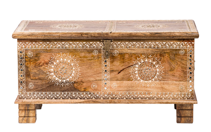 The Devra Sandook is a magnificent ode to traditional craftsmanship, where every carved detail speaks of heritage and grace. Handcrafted from richly grained hardwood, it showcases intricate mandala design—motifs inspired by ancient regal symbolism. The soft, honey-toned finish highlights the natural beauty of the wood, while the ornate patterns echo the legacy of royal Indian artistry passed down through generations.