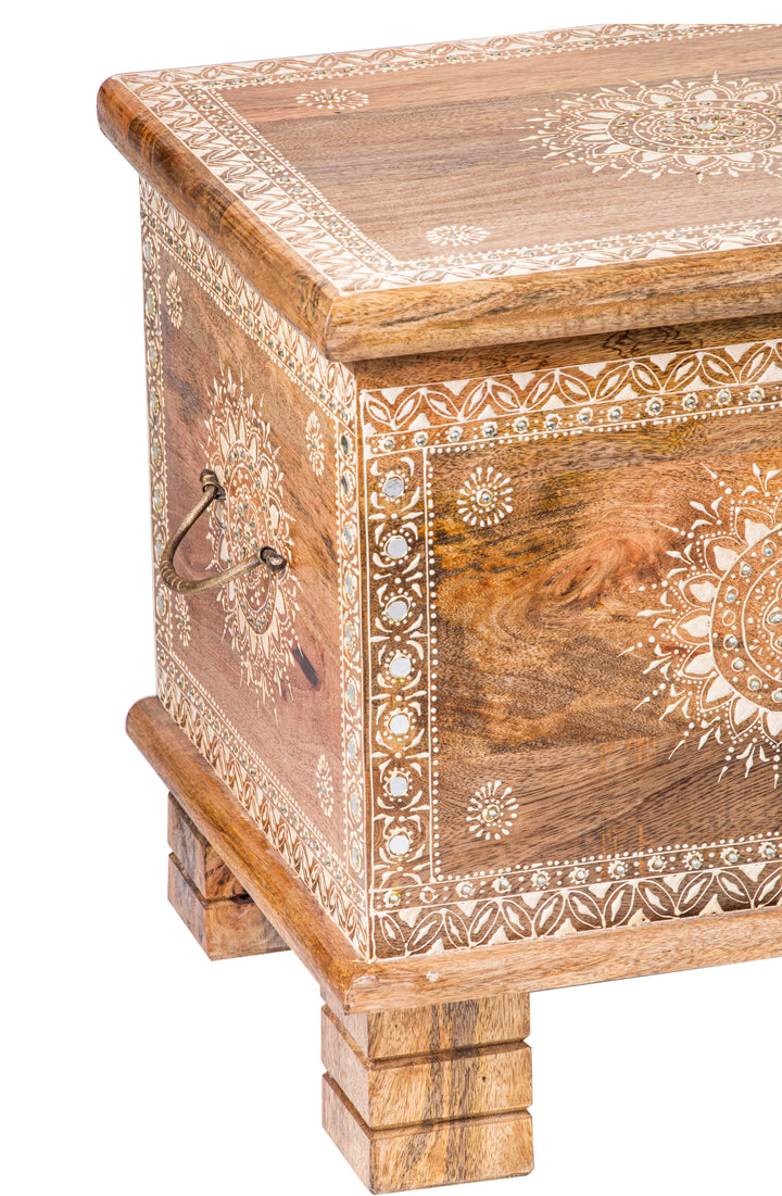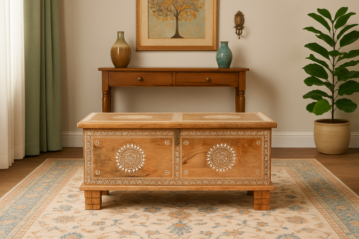 Both functional and poetic, this sandook serves as a spacious storage chest, coffee table, or statement piece in a hallway or bedroom. Its deep interior offers ample room for storing keepsakes, linens, or seasonal accents, making it a harmonious blend of utility and elegance. Whether styled in a contemporary home or a heritage-inspired setting, the Devra Sandook brings warmth, character, and an undeniable sense of timeless charm.