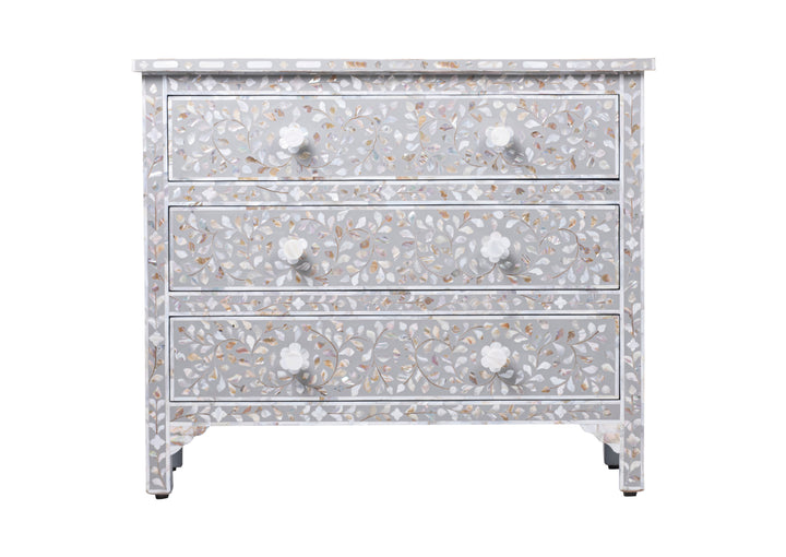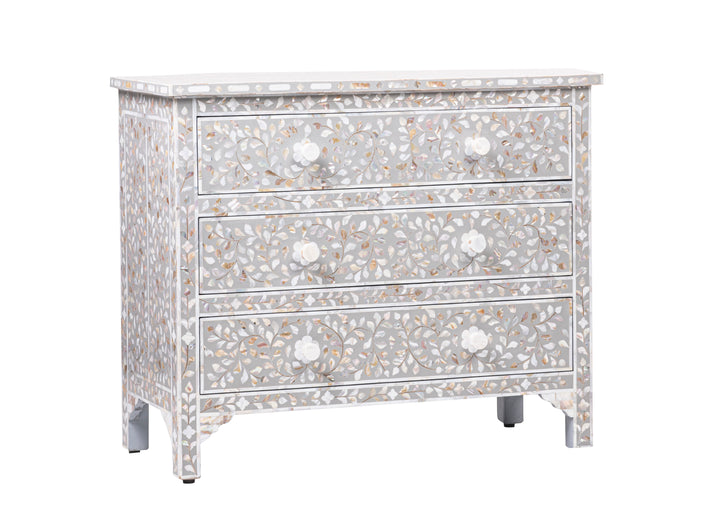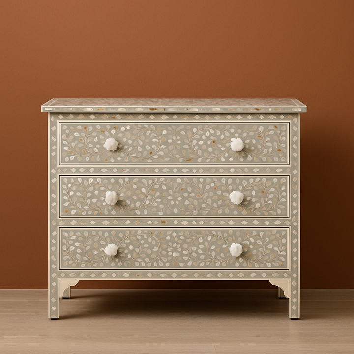 Refined, radiant, and steeped in artisanal splendour, the Heermahal Chest of Drawers is a timeless heirloom that brings the elegance of Indian palace interiors into contemporary living spaces. Its name, meaning "Palace of Diamonds", is a fitting tribute to the intricate mother-of-pearl inlay that graces every surface of this exquisite piece. Handcrafted by master artisans, the chest features a soft grey base overlaid with shimmering floral vines, individually cut and set with fragments of genuine mother of pearl.