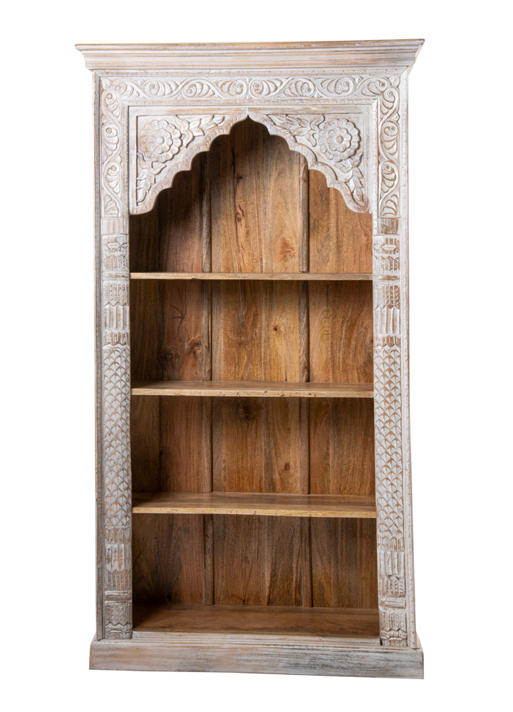 Bring timeless charm to your interiors with the Rajsi Vachan Shelf, a regal storage unit inspired by traditional Indian architecture. Featuring a hand-carved arched frame with floral and jaali motifs, this shelf blends intricate detailing with rustic warmth. The rustic white finish over natural wood tones creates a vintage patina, perfect for both classic and contemporary spaces.